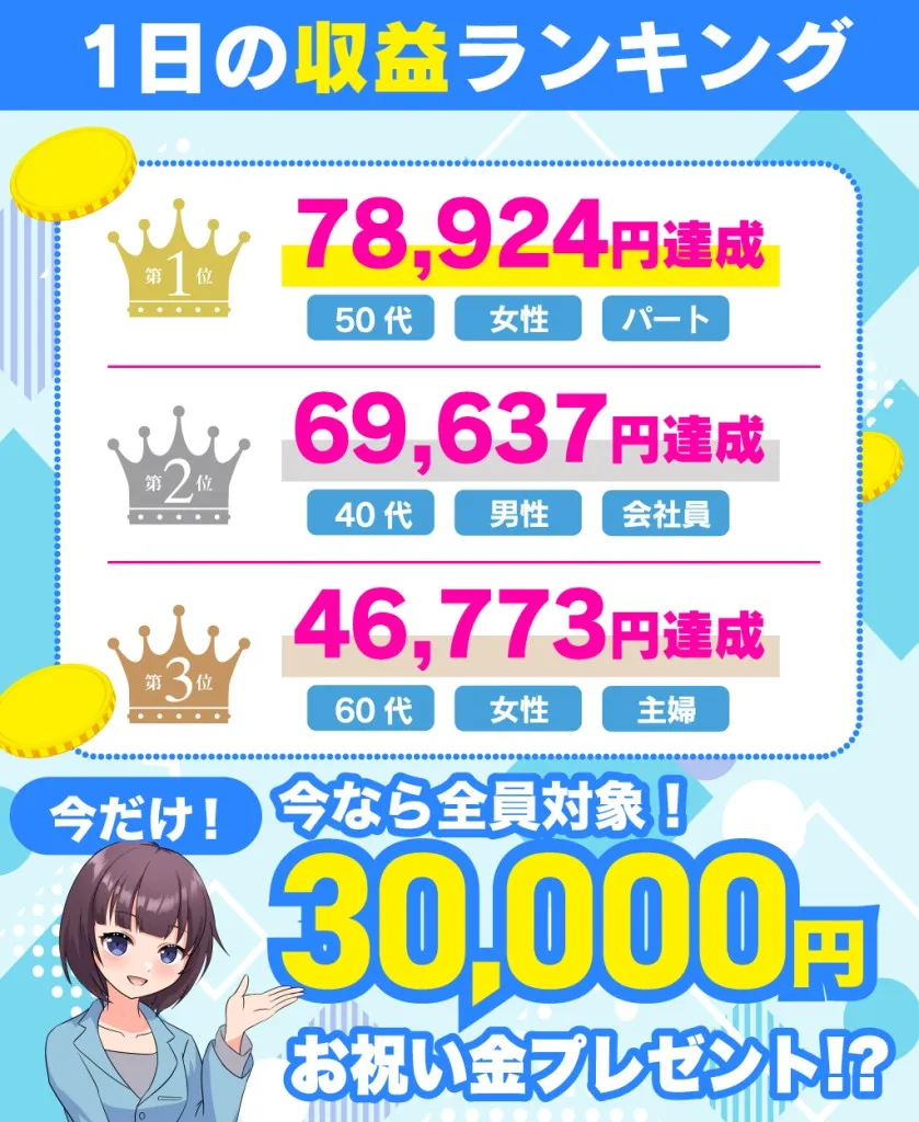 本業の収入が少なく、毎月支払いだけでほとんどお金が無くなってしまう現状を変えたくて参加しました。はじめは不安のほうが大きかったですが、言われた通り初日から1万円以上稼げて年柄にもなく飛び跳ねてしまいました。毎日安定して1万円程度稼げているので、今はかなり生活が安定しています。もっと早く始めておけば良かったな~と、後悔しているほどです。