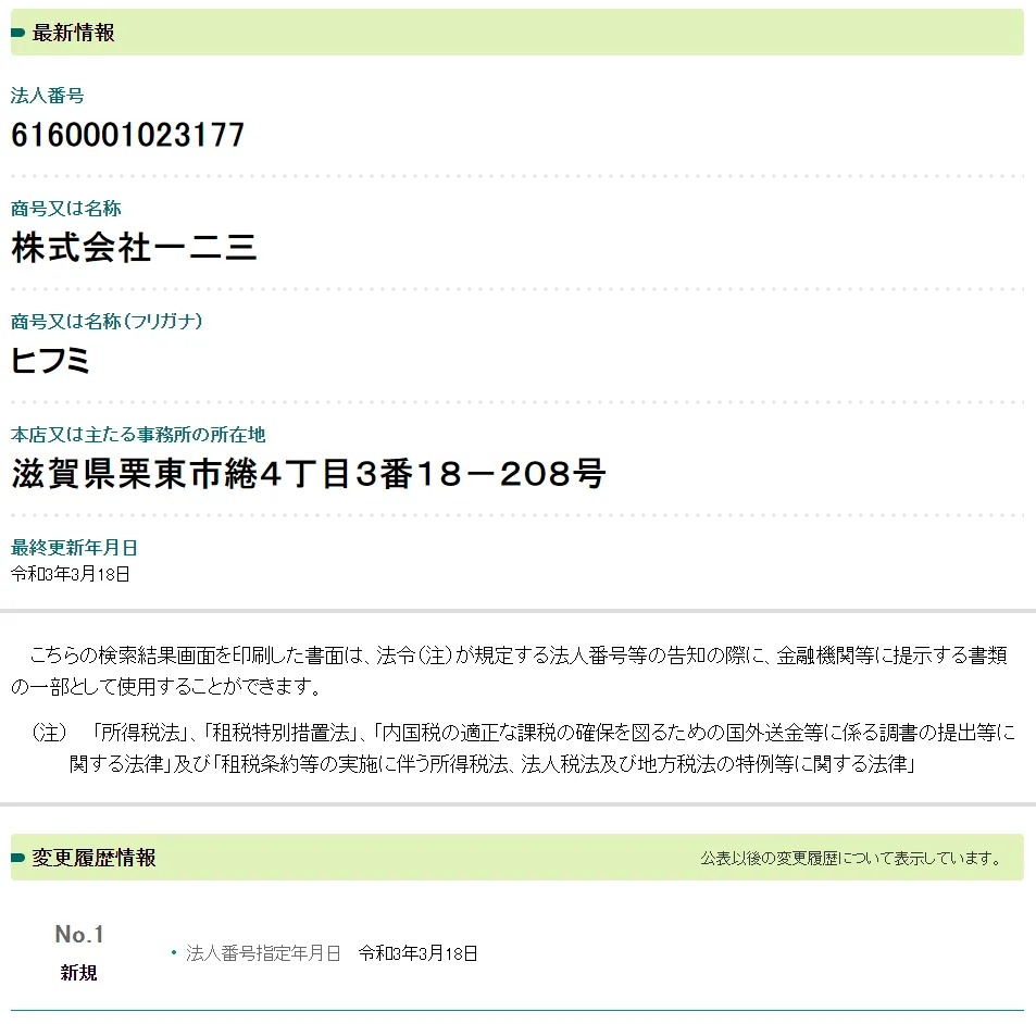 株式会社一二三の法人情報を調べてみると、2021年3月18日に法人番号の指定を受けていることが判明。