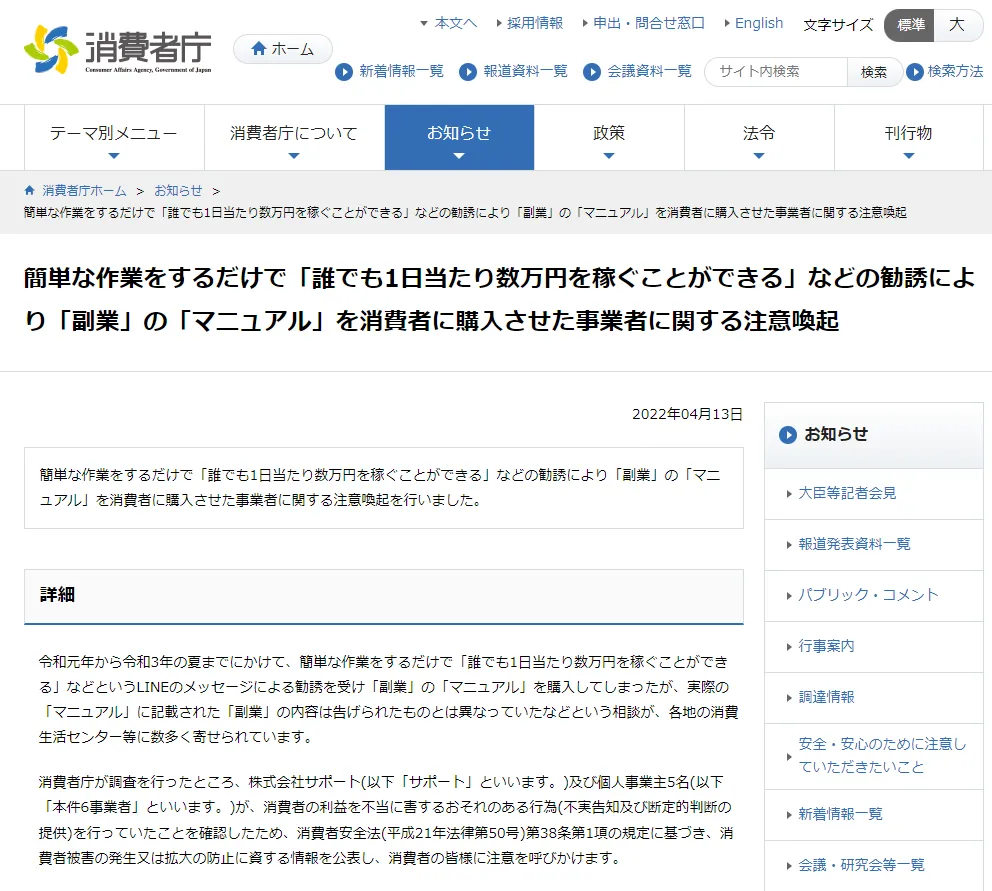 ここ最近、無知な素人を狙った副業詐欺業者が急増していて、消費者庁も大々的に注意喚起を行っているほどです。