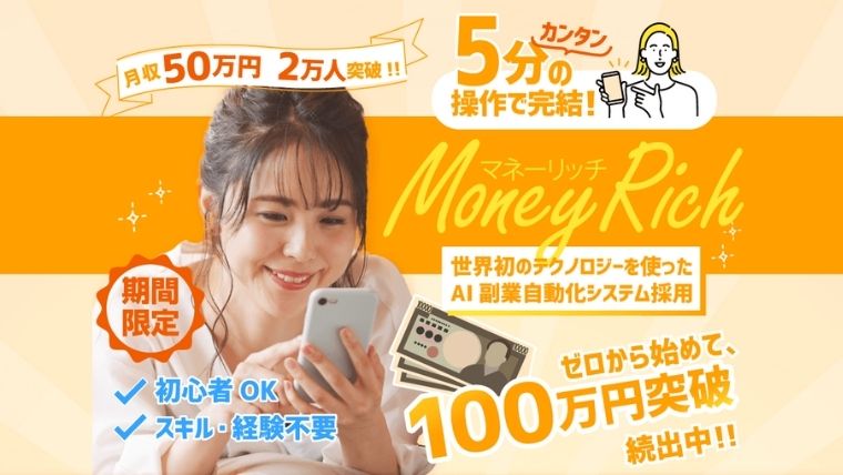 マネーリッチとは「スマホを放置で毎月50万円稼げる」と謳った最新副業商材です。