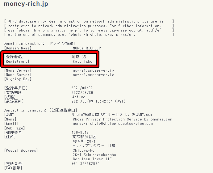 マネーリッチのドメインについて調べていると、「加藤拓」という人物がドメインの契約者であることが判明しました。