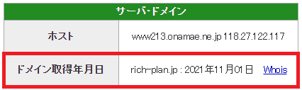 マネーリッチのドメイン(rich-plan.jp)を調べてみると、取得年月日が「2021年11月1日」ということが判明しました。