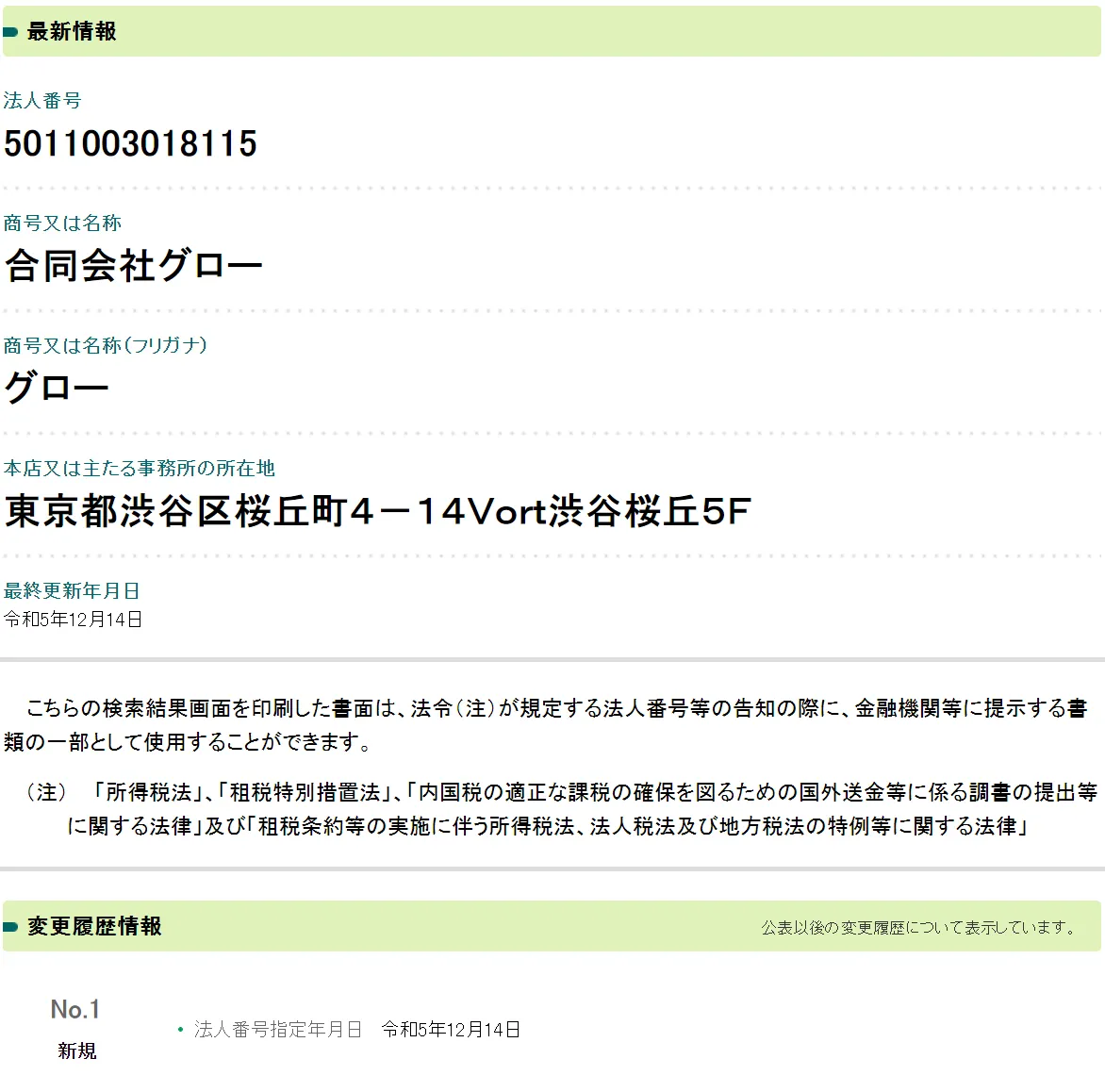 合同会社グローの法人情報を国税庁が運営する法人番号公表サイトで調べてみると、令和5年12月14日に法人番号の指定をされていることが分かります。