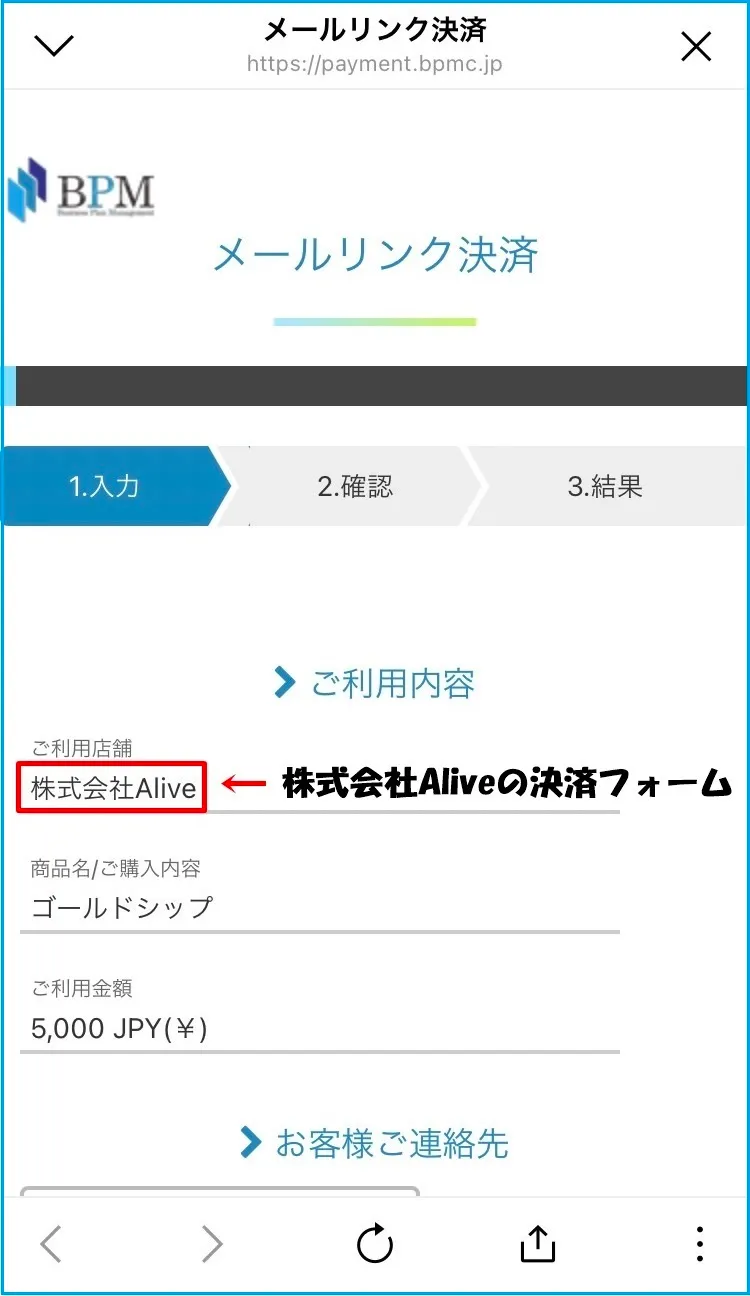 その証拠として特定商取引法に基づく表記には株式会社Aliveの電話番号が載っているほか、クレジット決済フォームにはガッツリと株式会社Aliveという社名が載っています。