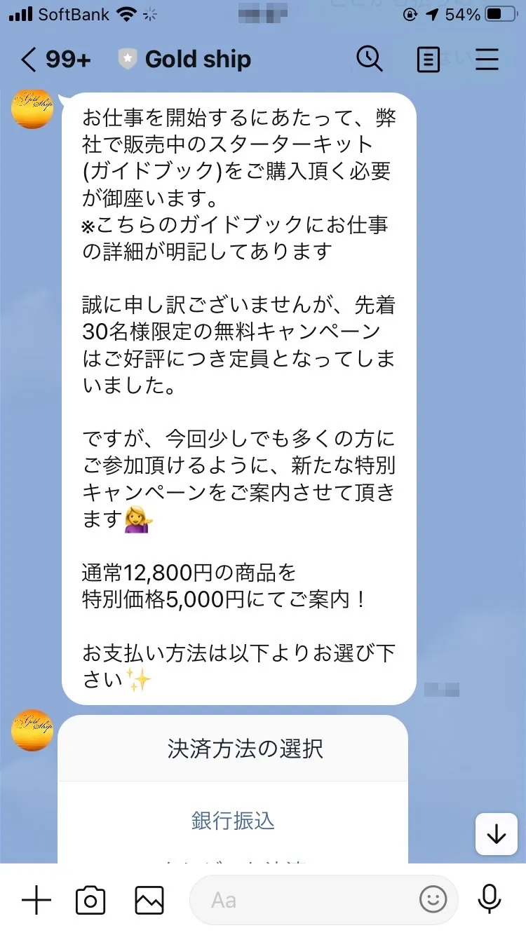 Gold Ship(ゴールドシップ)の公式LINEでは、5,000円を払えば副業を開始できるといった口ぶりでしたが、実際は違いました。