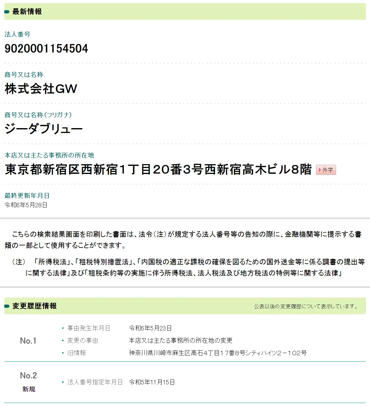 株式会社GWの法人番号が指定された年月日を国税庁が運営する法人番号公表サイトで調べてみると、「2023年11月15日」ということが分かりました。
