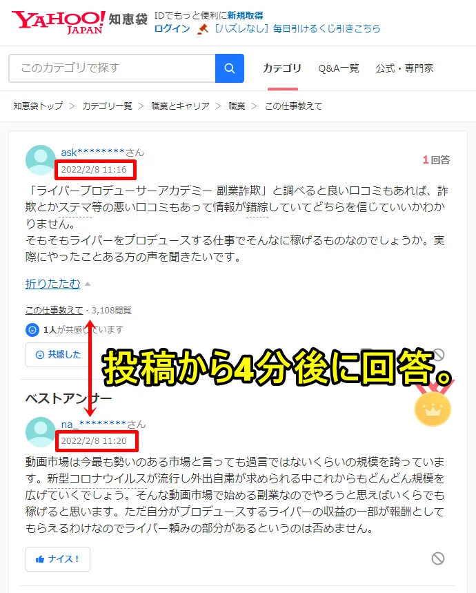 内容を確認すると、質問が投稿されてから回答するまでの時間がやたらと短いスレッドが散見されます。