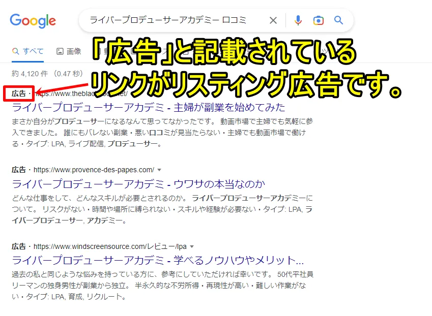 リスティング広告の掲載は当然ながら有料なので、ライバープロデューサーアカデミーの会員がわざわざ自腹を切って広告出稿しているとは考え難いです。