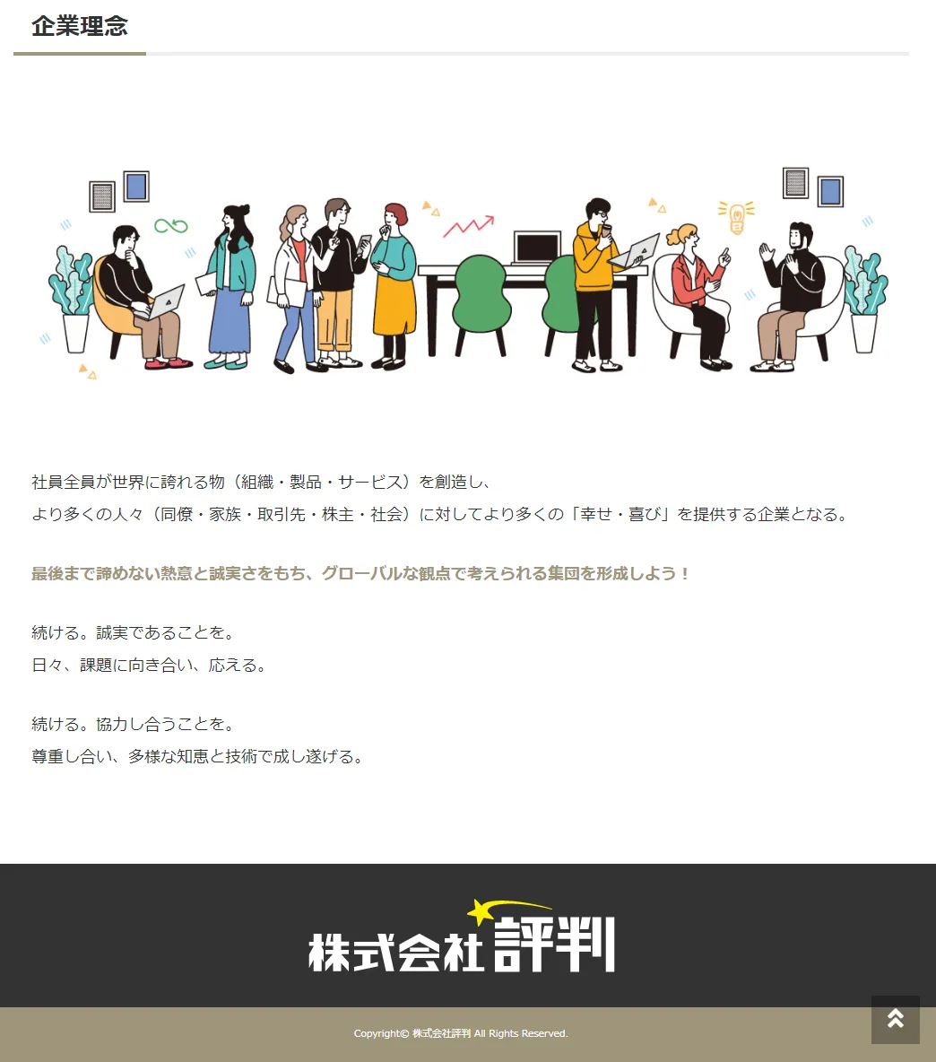 株式会社評判の会社ホームページを調べてみたところ、企業理念を他社から盗用して作成していることが判明しました。