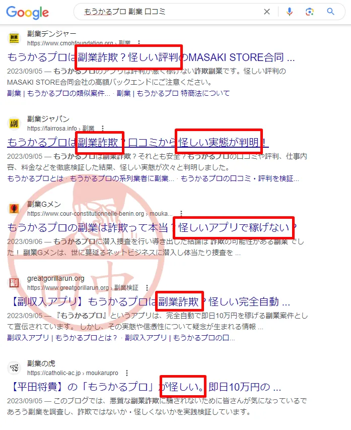 実際にGoogleやYahooなどの検索エンジンで調べてもらうとすぐ分かりますが、「怪しい副業」や「詐欺の可能性がある副業」といったネガティブ評価で検索結果が埋め尽くされています。