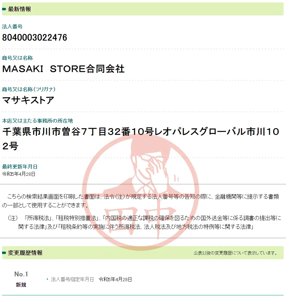 MASAKI STORE合同会社の法人情報を調べてみると、2023年4月29日に登記された会社ということが分かります。