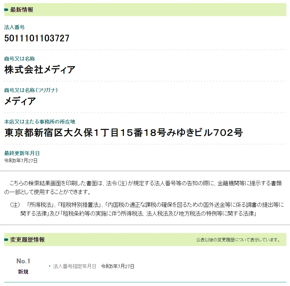 株式会社メディアの法人情報を調べてみると、2023年7月27日に登記されたばかりの新しい会社ということが判明。