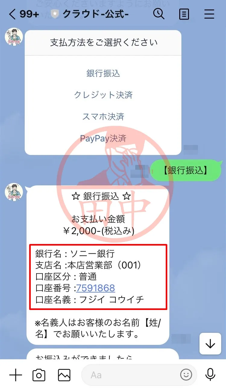 LINEで案内された初期費用の振込先は代表取締役社長「藤井弘一」の個人口座となっていました。