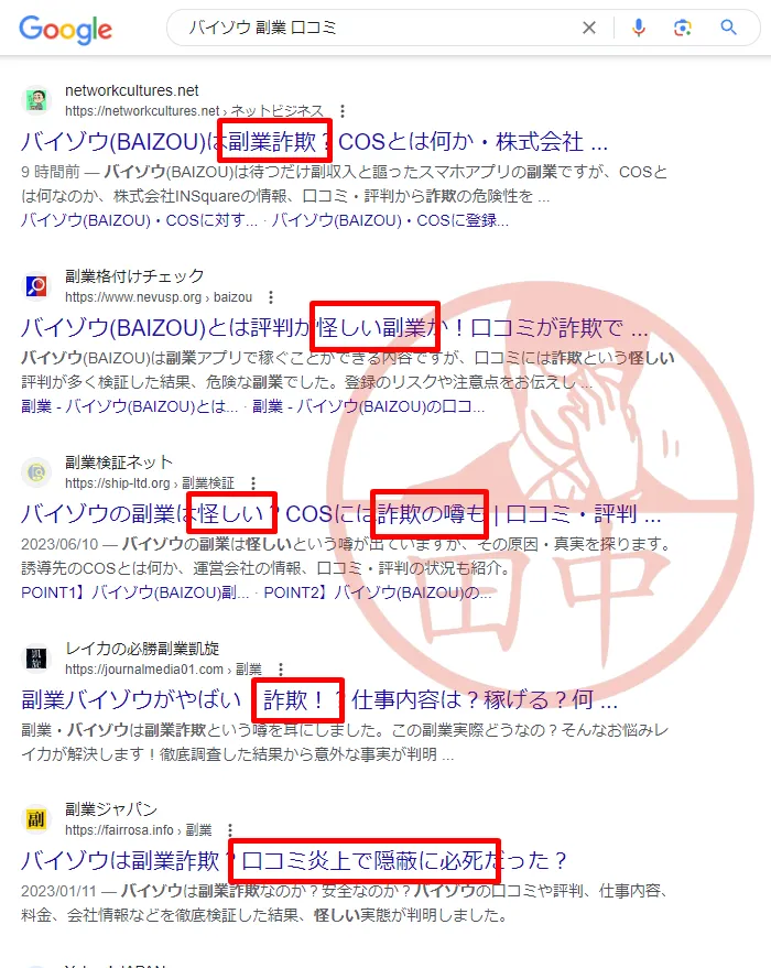 バイゾウの口コミや評判を調べると、「怪しい」「副業詐欺の可能性がある」といったネガティブ評価が大量に出てきます。