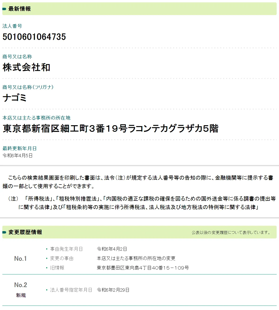 株式会社和の法人情報を法人番号公表サイトで調べてみると、2024年2月29日に法人登記されたばかりの会社ということが判明しました。