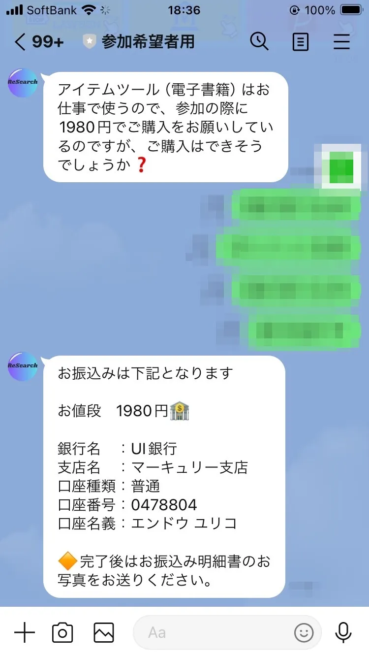株式会社和の公式LINEで案内された初期費用の振込先は代表責任者「遠藤友里子」の個人口座となっていました。