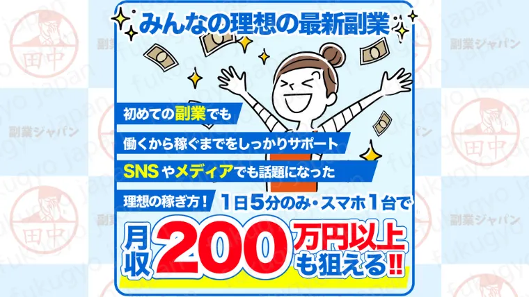 「みんなの理想の最新副業」とは、やる気次第で月収200万円以上を確実に目指せる副業とのこと。