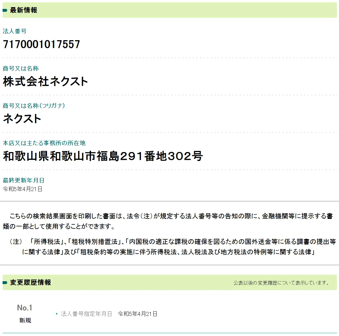 まず、株式会社ネクスト(今井夏樹)が設立された時期を法人番号公表サイトで調べてみると、2023年4月ということが判明。