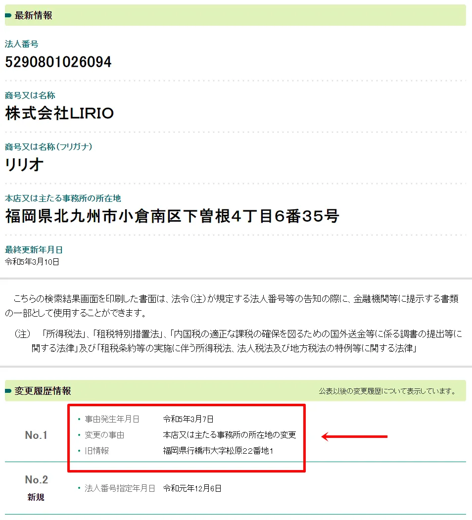 「株式会社LIRIO」の法人情報を法人番号公表サイトで念のため調べてみたところ、会社ホームページに載っている所在地は古い住所で、2023年3月に移転していることが分かりました。