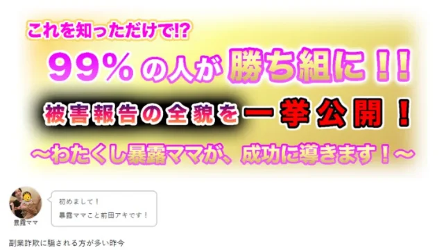 副業 暴露ママ「前田亜希」は詐欺師?紹介される副業が危険だった? 2022年11月28日 副業スペシャリストtanaka https://jobchoice.jp/wp-content/uploads/2024/09/fukugyo-freedom-logo.png 副業詐欺からの解放「副業フリーダム」 暴露ママ「前田亜希」は、副業詐欺の闇を暴くと謳って、LINEアカウントへ登録を促している人物です。 怪しい副業や詐欺まがいな副業が蔓延 …