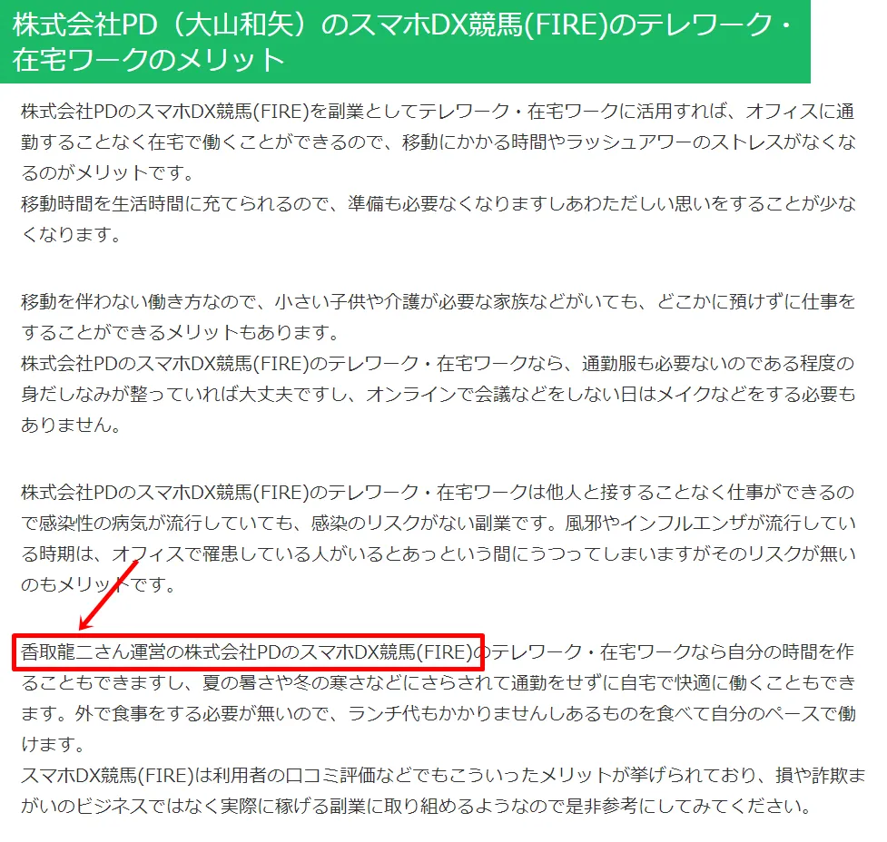 その中の1つに「香取龍二さん運営の株式会社PDのスマホDX競馬(FIRE)」と記載しているブログ記事を発見しました。