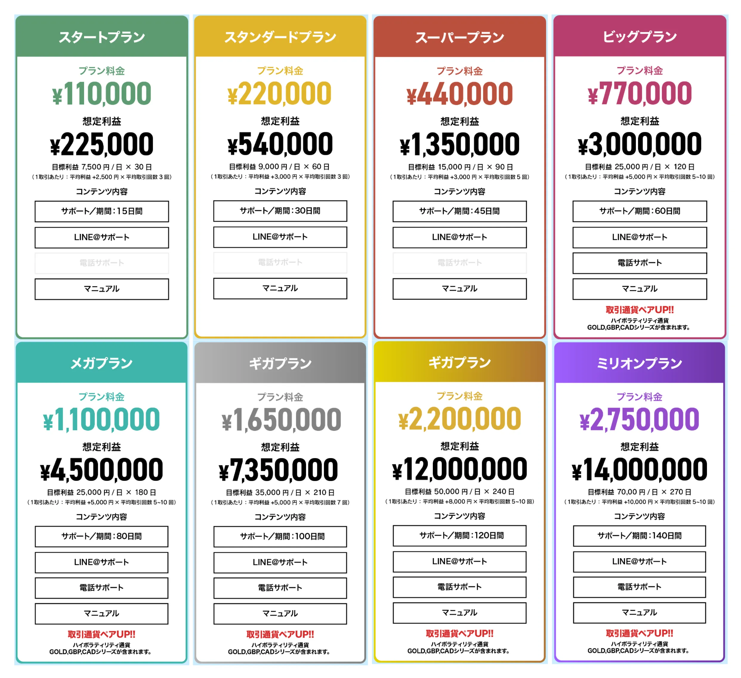 こちらが実際のプラン表で、最安で11万円~最高で275万円の超高額料金設定です。