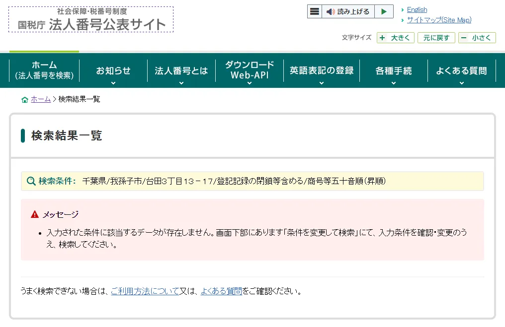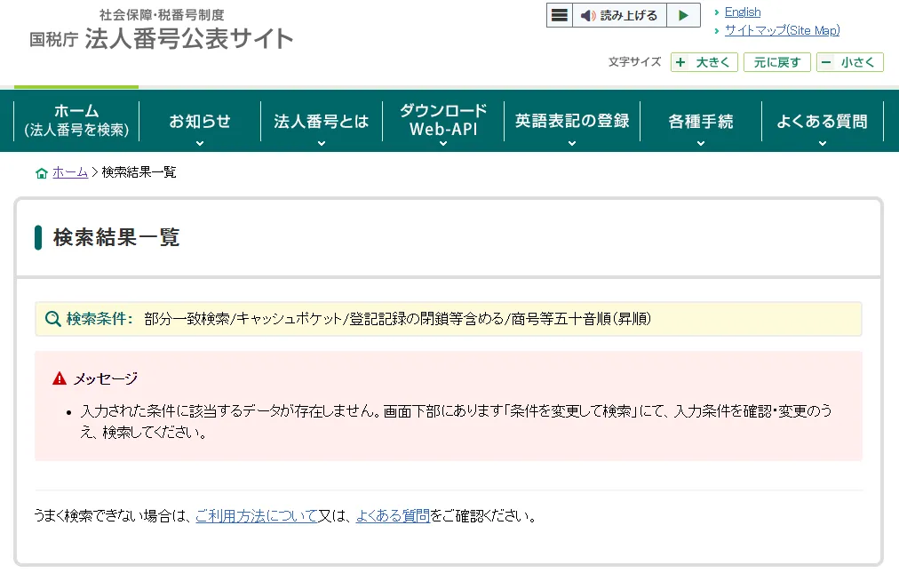 国税庁が運営する法人番号公表サイトで屋号の「キャッシュポケット」を検索しましたが、該当する法人はゼロでした。