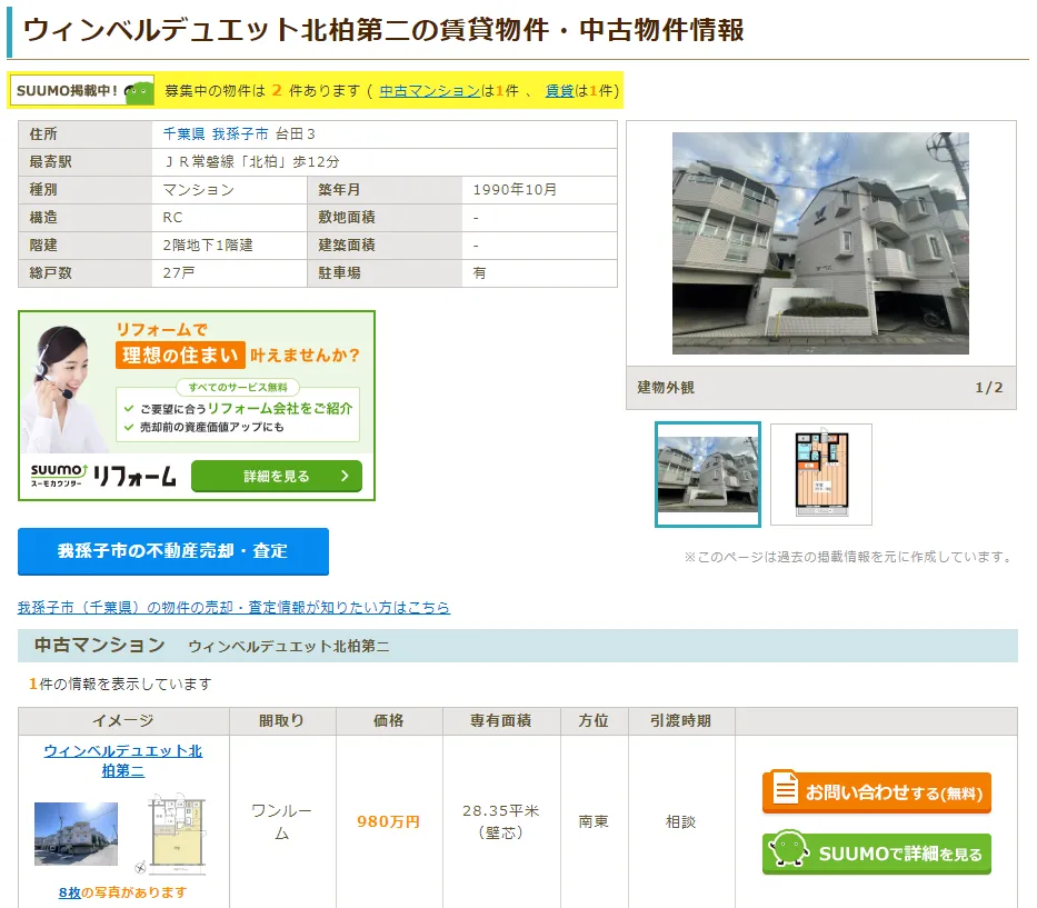 住所の「ウィンベルデユエット北柏第二」を調べてみると、築34年のマンションということが分かりました。(築年数は検証日時点)