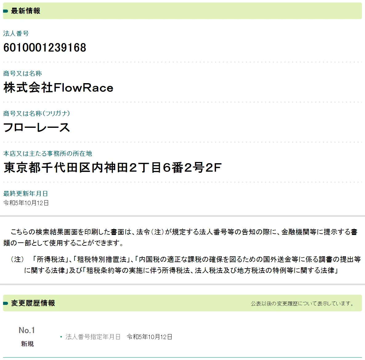 株式会社FlowRaceが登記を行った年月日を国税庁が運営する法人番号公表サイトで調べてみると、「2023年10月2日」ということが分かりました。