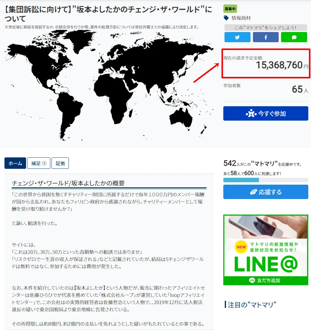 上記のように謳い、勧誘を行っていた「チェンジ・ザ・ワールド」という情報商材の利用者から被害を訴える声が続出。