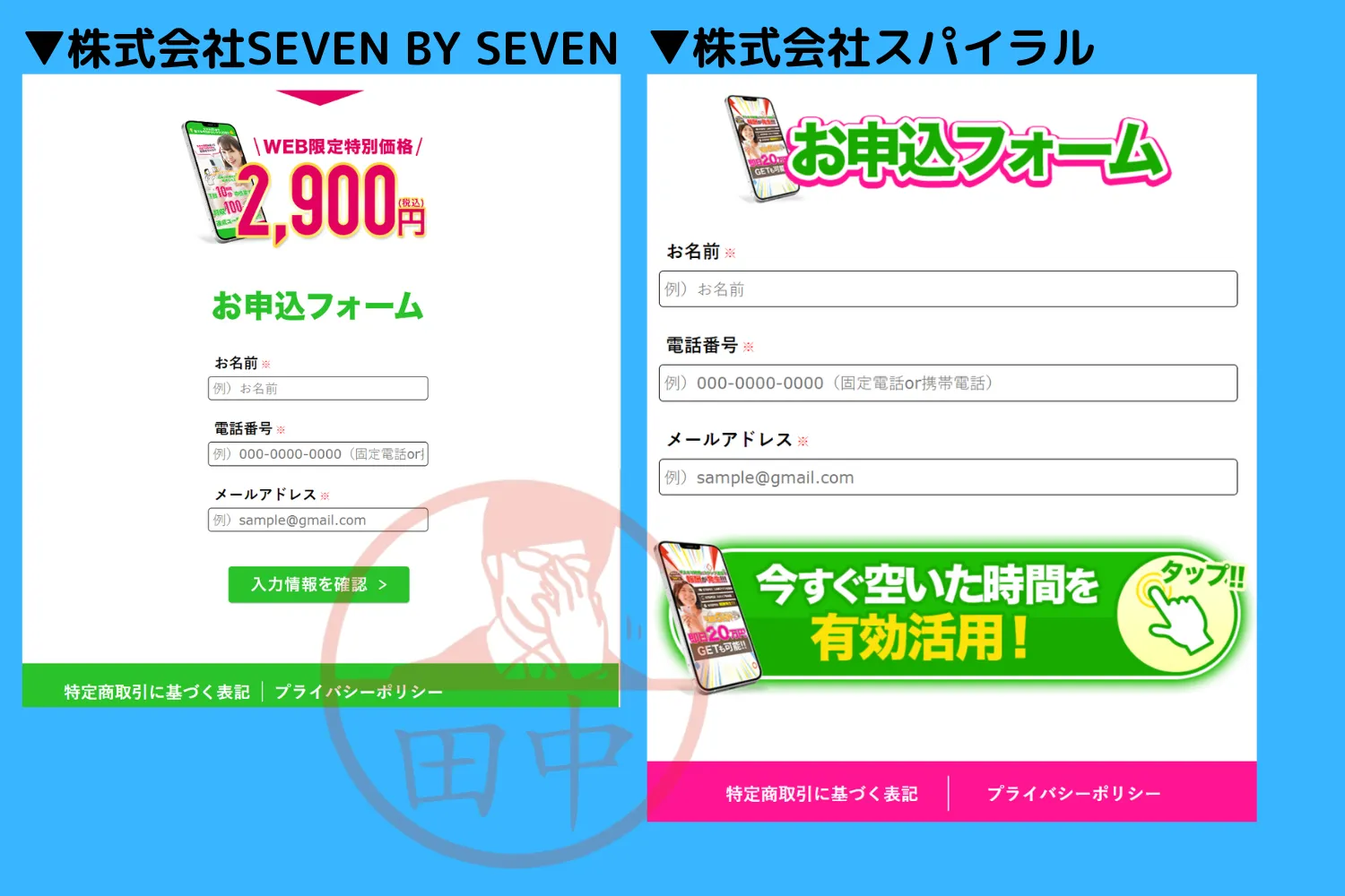 普通は他社と被ることが無い、特定商取引法に基づく表記が一言一句同じ内容で、申込フォームの雛形も完全一致していたからです。