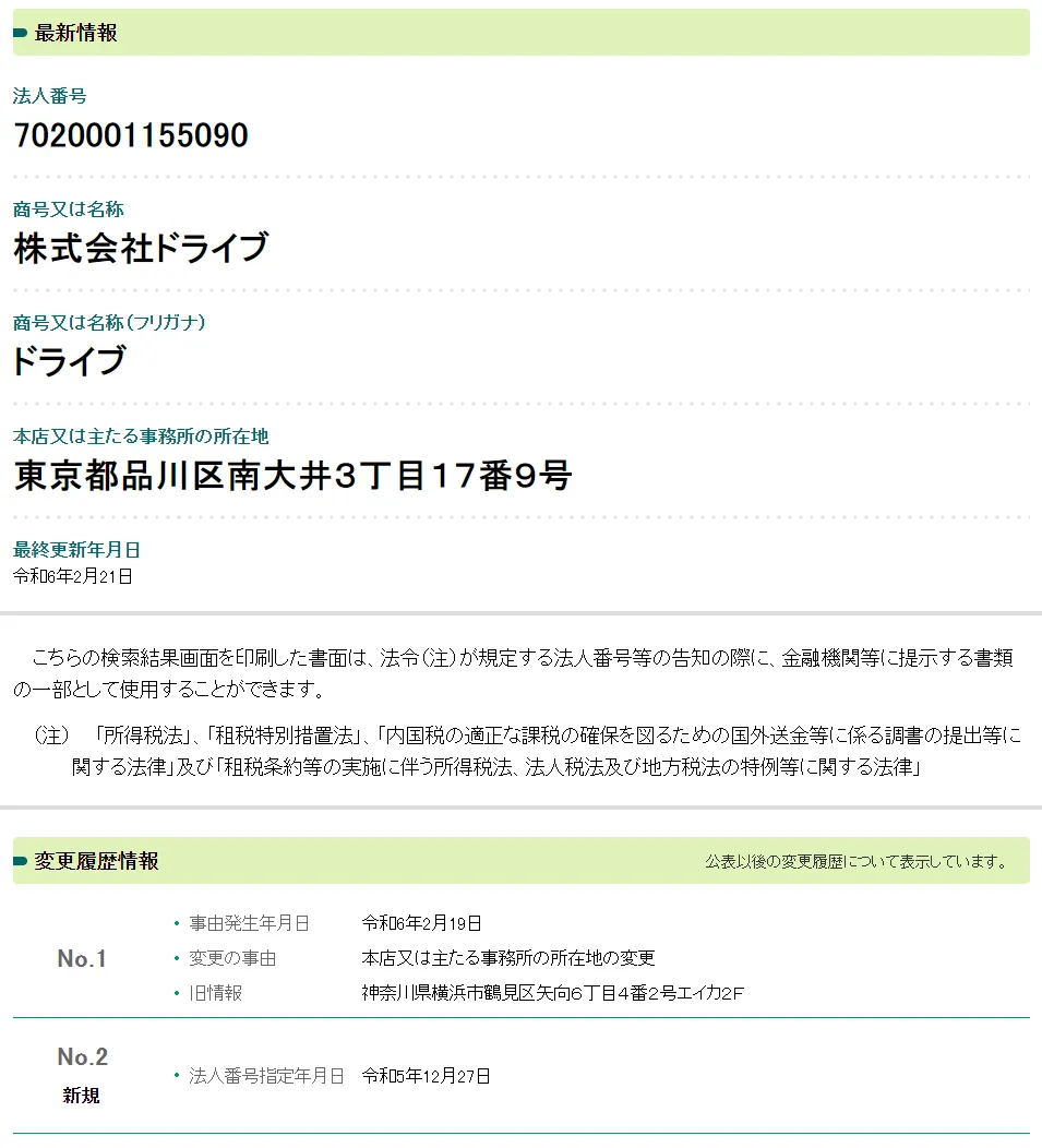 以下、株式会社ドライブ(駒形哲治)について調べてみると、2023年12月27日に法人登記されたばかりの会社ということが判明しました。