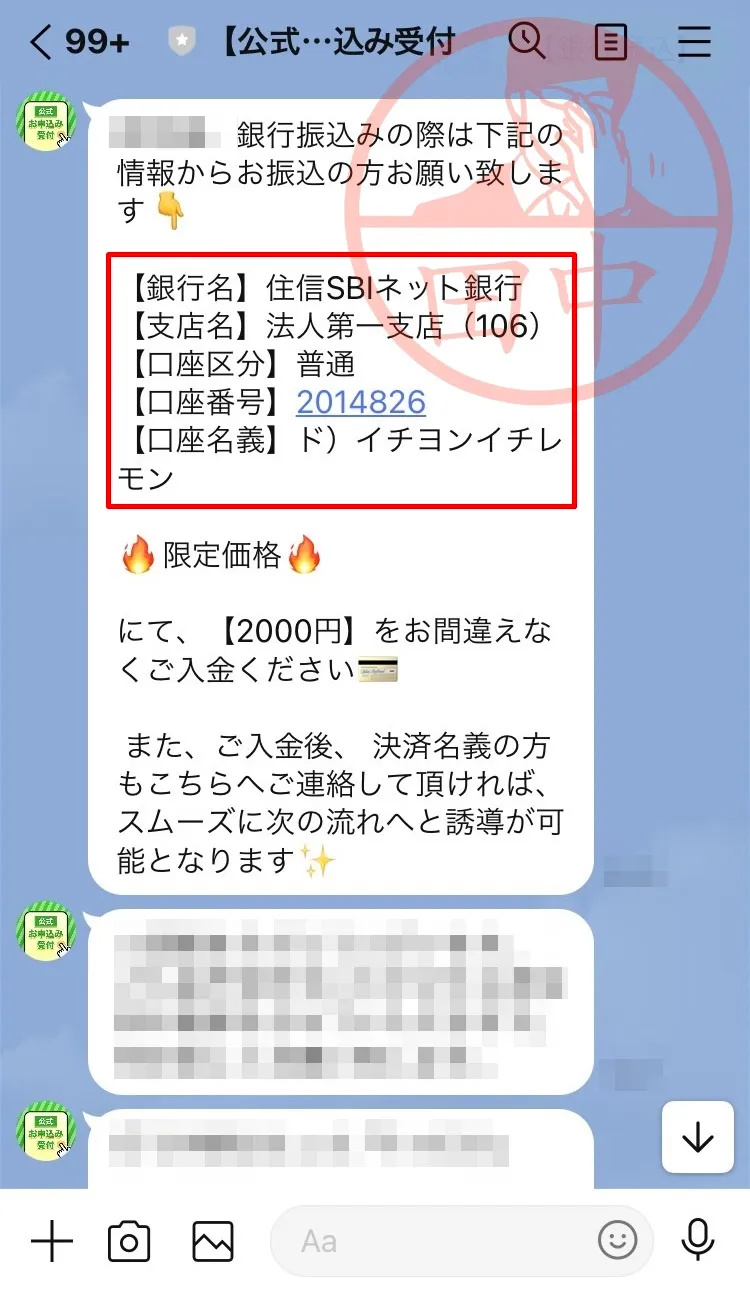 LINEで案内される初期費用の振込先は「合同会社イチヨンイチレモン」という全く別の法人口座でした。