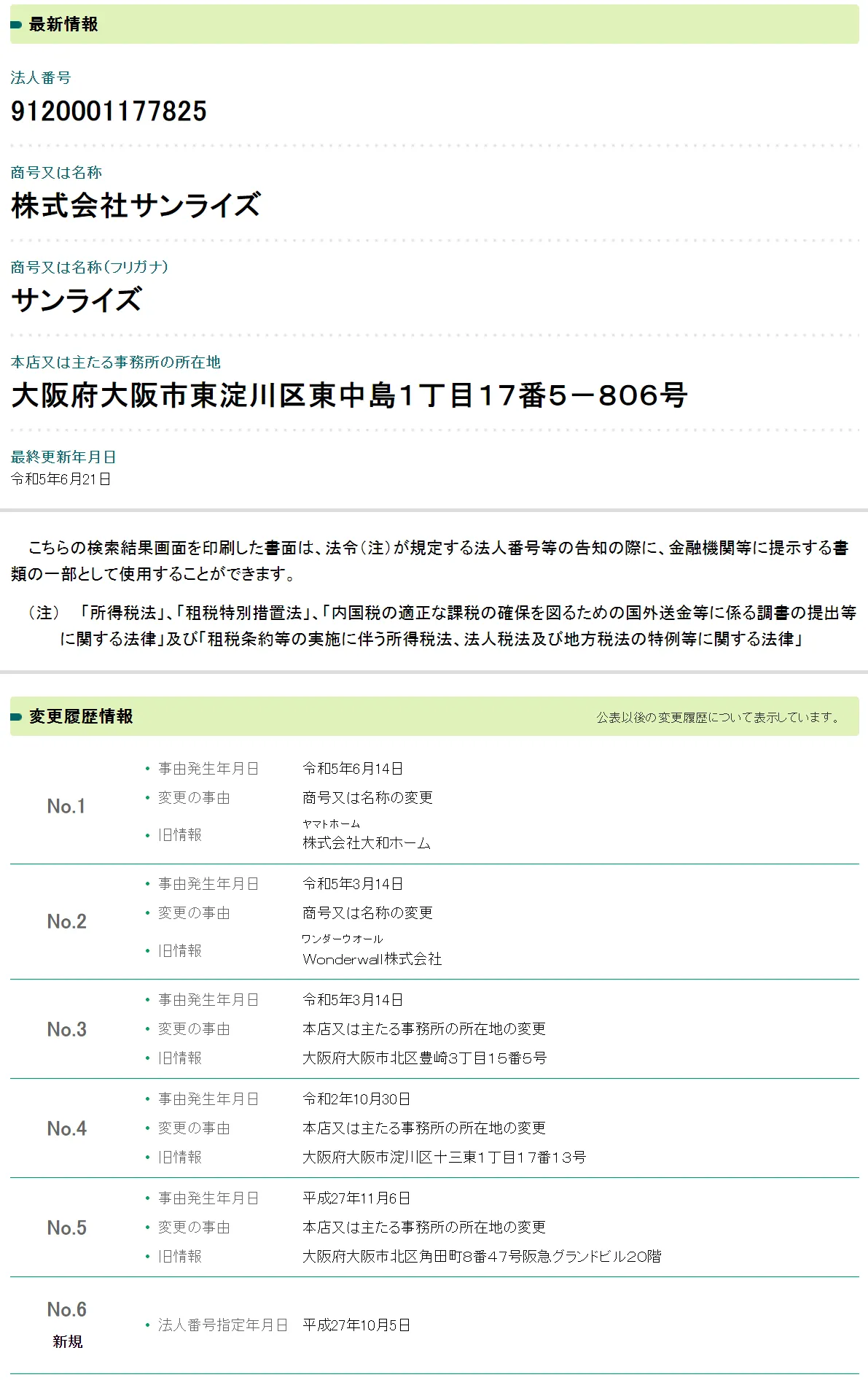 株式会社サンライズの法人情報を国税庁が運営する法人番号公表サイトで調べてみると、2023年に2度も社名を変更していることが判明しました。