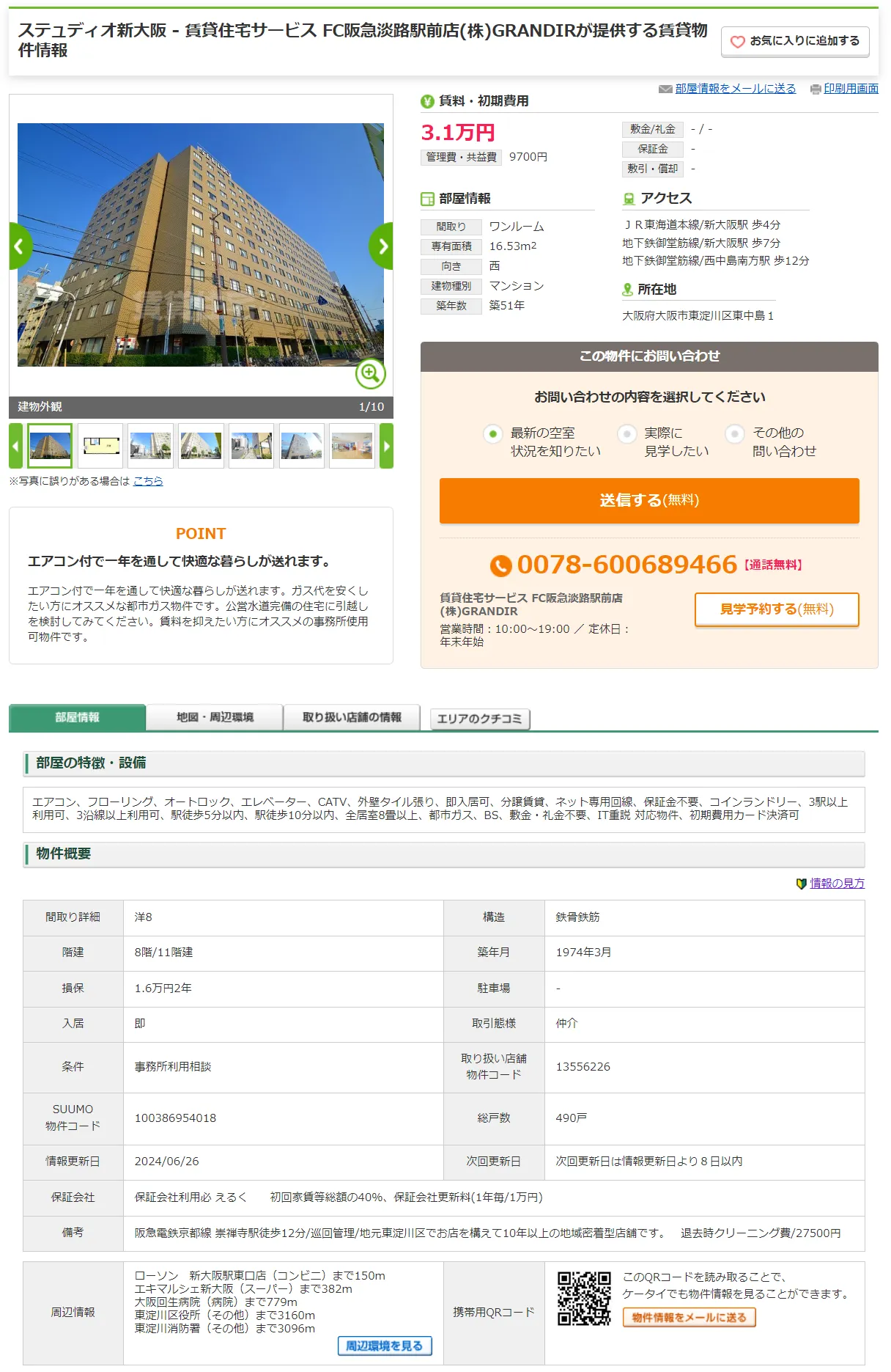 本店所在地として登記されている「大阪府大阪市東淀川区東中島1-17-5-806」の物件情報がこちらです。