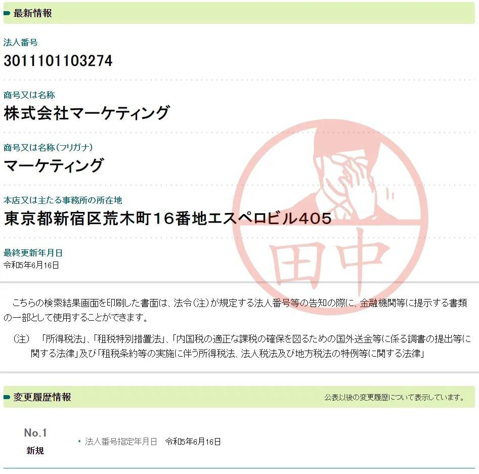 株式会社マーケティングの法人情報を調べてみると、2023年6月16日に登記されていることが判明しました。