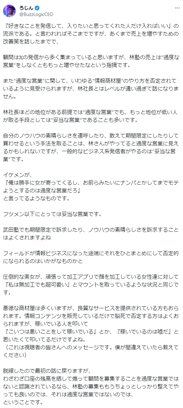林尚弘からしたら、現在の営業スタイルで売上が作れていて、フォロワーも自分のほうが多いので、指摘された内容がいまいち腑に落ちないのは仕方ないでしょう。