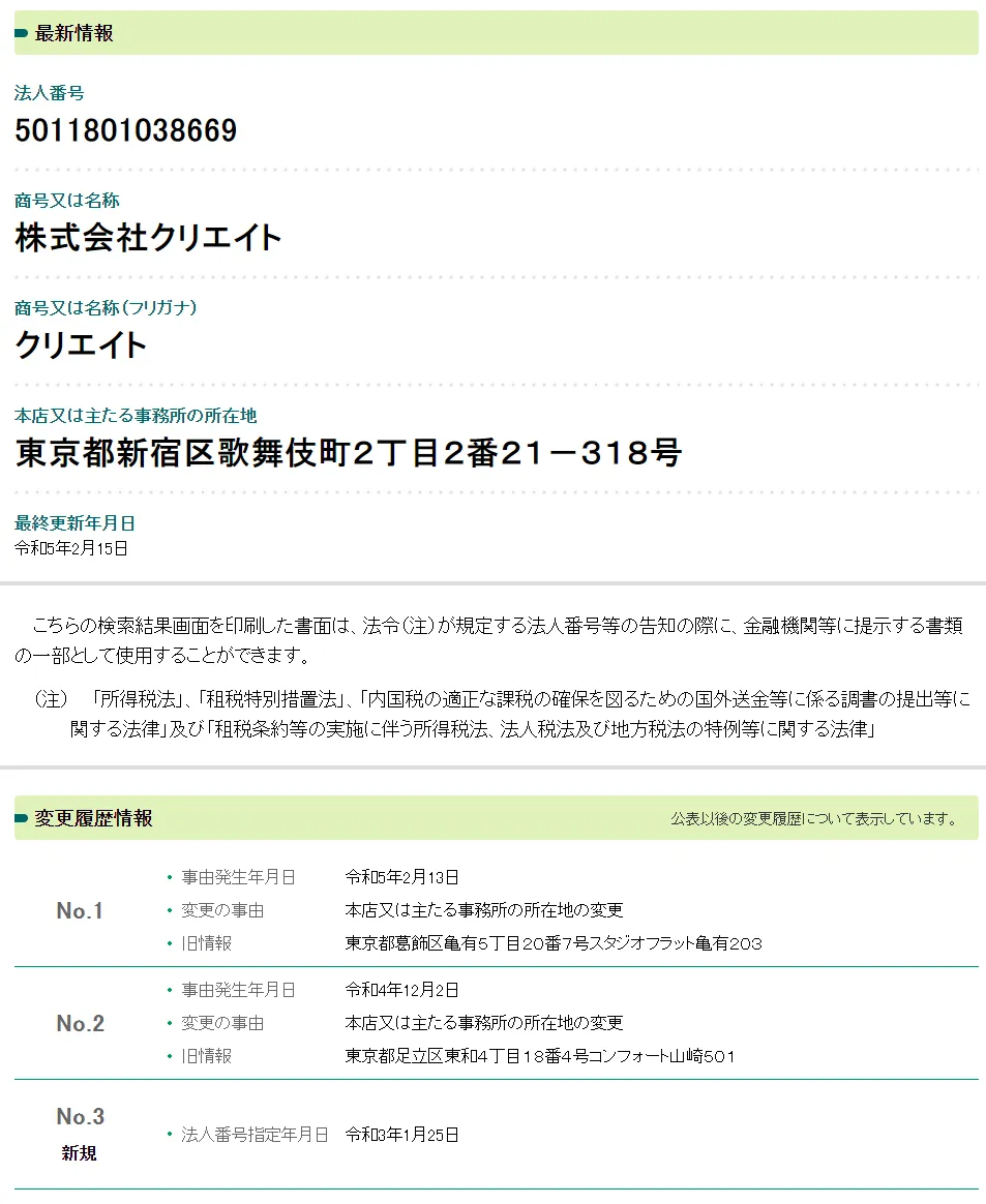 株式会社クリエイトの法人情報を調べてみると、2021年1月頃に設立された会社ということが分かります。